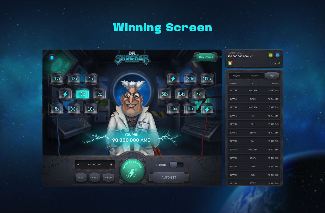 The Dr. Shocker game represents a richly illustrated and functional gaming experience. It is a turbo game that features an animated block showcasing the professor and his electric mechanism. In the game, players place bets on Dr. Shocker's attempt to connect electrical cables. If successful, players win based on odds from the 1-18 multiplayer sections on the game board. The game features 3 bonus sectors, each unlocking different bonus rounds with reward opportunities.