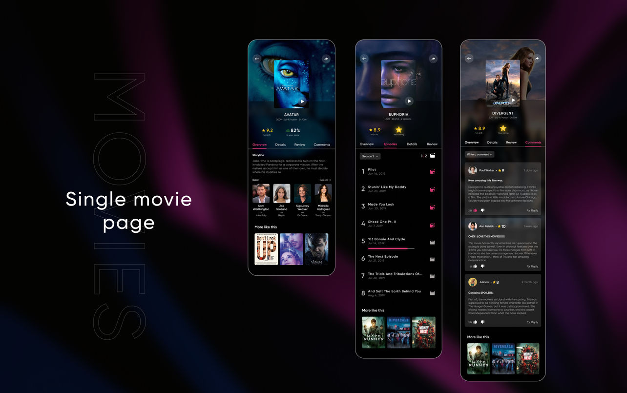 Nowadays streaming services have become one of the most popular forms of entertainment. Movie was my first UI/UX Design project, it offers a wide range of on-demand movies, shows and TV which are available anytime. My aim was to design a high quality on-demand streaming service for watching movies on different devices. I made a completely new product from scratch, which can be well appreciated by users. The goal was to solve user problems and take into account their requirements to create fully-functional service.